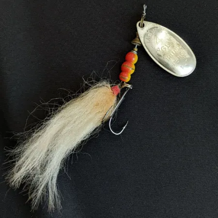 На сріблястій пелюстці викарбовано «MEPPS AGLIA» та «BRITISH PATENT», що вказує на міжнародну історію цієї моделі, розробленої Андре Мюльнаром. При вазі 10 г (1/3 унції) та довжині 7 см (2 3/4 дюйма), ця вертушка 4-го номера оснащена трьома намистинами з градієнтом теплих помаранчевих та жовтих кольорів. Оперіння з натурального хутра з червоною обмоткою у місці кріплення створює виразний силует позаду пелюстки, що обертається. На зворотному боці сріблястої пелюстки маркування «MADE IN FRANCE» підтверджує її походження перед збиранням для американського ринку. На цьому конкретному екземплярі (артикул 17911) оригінальний трійник було замінено. Приманка оцінена на 4/5 і перебуває у гарному вінтажному стані з чистою фурнітурою та добре збереженою мушкою. Система обертання з конусом розроблена для миттєвого заведення пелюстки на початку проводки, що робить цю модель незамінною для лову щуки, великого окуня чи судака.