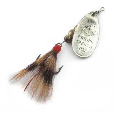 На сріблястій пелюстці викарбувано маркування «MEPPS 4 AGLIA» та «BRITISH FRENCH PAT», що вказує на міжнародне походження цієї вертушки вагою 10 г (1/3 унції). Цей екземпляр середини минулого століття має класичне узлісся з білячого хвоста на трійнику, охайно закріплене яскравою червоною ниткою біля основи. Загальна довжина приманки становить 7 см (2 3/4 дюйма). Mepps Aglia 4 Dressed була зібрана в США з високоякісних французьких комплектуючих. Латунні намистини сердечника зберегли свій початковий блиск, а вся фурнітура залишилася рівною та повністю робочою. Приманка з артикулом 23569 перебуває у дуже доброму стані (4/5) і є гарно збереженим зразком дизайну рибальських снастей 1970-х років. Природні коричневі та чорні відтінки хутряного узлісся створюють виразний візуальний контраст із дзеркальною металевою поверхнею пелюстки.