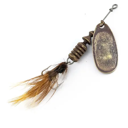 На латунній пелюстці чітко відкарбовано легендарне «3 COMET» та маркування франко-британського патенту — ця вертушка середини минулого століття втілює трансатлантичну історію бренду Mepps. При вазі в 1/4 унції (6,5 г) приманка має розбірну конструкцію: дротяний каркас довжиною 7 см (2 3/4") дозволяє швидко замінити трійник з опушкою. Ці компоненти були виготовлені у Франції, а згодом зібрані у США — поширена практика 1960-х років, що стала визначальною для моделі 20052. Латунне осердя складається з характерного рифленого барильця та конусного відбійника; приманка має природні сліди використання, що відповідають оцінці стану 3/5. Гачок зберіг оригінальну опушку з коричневого та рудого пір’я, яка надає приманці природного силуету. Цей екземпляр демонструє класичну геометрію французької пелюстки, розраховану на різні варіанти закидання та проведення.