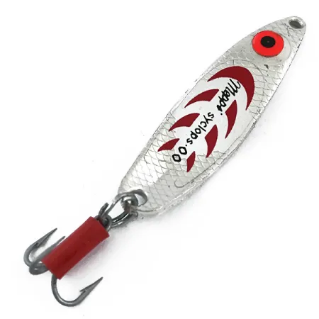 Чітке маркування «USA» на увігнутій сріблястій поверхні свідчить про те, що перед нами оригінальна блешня Mepps американського виробництва. При довжині 4 см (1 1/2") ця Mepps Syclops 00 (артикул: 5038) вирізняється яскравим сріблястим покриттям, прикрашеним десятьма червоними «півмісяцями» та виразною червоною точкою атаки у вигляді ока. Хоча на ній вибито «1/6 oz», офіційна вага моделі 00 становить 4,5 г (3/16 oz), що робить її універсальним вибором для закидання легкими снастями. Оснащення складається з міцного заводного кільця та гострого трійника з фірмовим червоним кембриком-подразником. Стан приманки оцінюється на 5/5: вона виглядає чудово збереженою, з фактурним малюнком луски, що добре відбиває світло, та чітким чорним написом «Mepps Syclops 00». S-подібна форма тіла розроблена для лову в закид та тролінгу, дозволяючи текстурованій металевій поверхні ефективно грати на світлі.