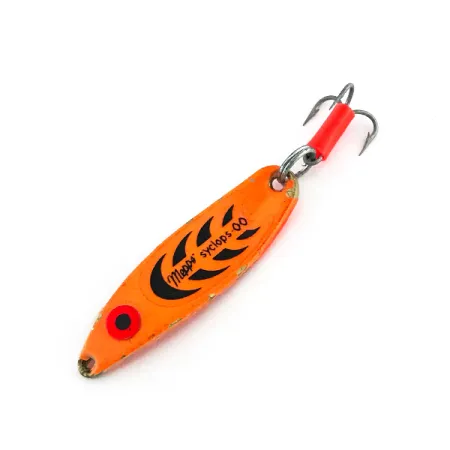При вазі 4,5 г ця блешня Mepps Syclops 00 UV має характерний профіль, розроблений для далекого та точного закидання. Тіло довжиною 4 см виконане в яскравому кольорі Fluorescent Orange, що дає інтенсивне жовто-гаряче світіння в ультрафіолетовому світлі. Ця вироблена в США коливалка з артикулом 8727 має чорний хвилеподібний малюнок та чітке штампування назви моделі на лицьовій стороні. У передній частині розташоване яскраве червоне око з темною зіницею, а у хвостовій частині закріплено трійник, оснащений яскраво-червоним кембриком. Приманка перебуває у стані 5/5, зберігши оригінальне глянцеве покриття та чіткість графічних деталей. S-подібний вигин металевого тіла забезпечує стабільну гру на різних швидкостях проводки, як під час закидання, так і при вертикальному джигуванні.