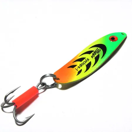 Флуоресцентне покриття корпусу цієї коливалки довжиною 6 см змінюється від яскравого шартрезу біля «ока» до насиченого помаранчевого кольору в хвостовій частині. Ця модель Mepps Syclops 1 (артикул 0309) має характерні чорні візерунки у формі півмісяців на боках, що імітують вигляд малька. Зі зворотної сторони приманка вагою 12 г має золотисте поліроване покриття з чітким штампуванням логотипа виробника та написом «Made in France». Оснащення складається з міцного заводного кільця та гострого трійника, на цівці якого встановлено яскравий флуоресцентно-помаранчевий кембрик. Завдяки виразному вигину профілю, блешня чудово підходить як для закиду, так і для тролінгу, демонструючи класичну якість французької школи Mepps. Приманка перебуває у відмінному стані (оцінка 5/5), зберігаючи первісний блиск лакофарбового покриття та металевої поверхні.