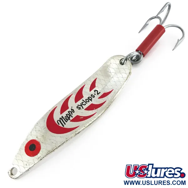Нікельоване покриття з малюнком луски визначає зовнішній вигляд цієї 7,5-сантиметрової (3") блешні з Франції. При вазі 17 г (3/5 унції) Mepps Syclops 2 вирізняється яскравим червоним оком та відповідними бічними мітками, що чітко виділяються на фоні полірованого сріблястого корпусу. У цього конкретного екземпляра, внесеного в каталог під кодом 8842, стан оцінюється як відмінний (5/5), а чорний напис «Mepps Syclops 2» залишається чітким і розбірливим. Оснащення включає міцний трійник, захищений класичним червоним кембриком і закріплений за допомогою надійного заводного кільця. На зворотному боці чиста металева поверхня підкреслює точний вигин профілю блешні. Отвір для кріплення волосіні у вузькій частині охайно пробитий, що демонструє контроль якості, притаманний заводу Mepps.