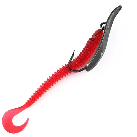 Чорне покриття блешні у поєднанні з яскраво-червоним двохвостим твістером Mister Twister Split Double Tail — це впізнавана риса моделі Mepps Timber Doodle 1 (артикул 22584). При вазі 12 г (2/5 унції) та довжині 6 см (2 1/4 дюйма), ця вироблена в США приманка вирізняється спеціальною конструкцією-незачіпляйкою. Гачок вдало захований у силіконовому тілі, що дозволяє уникнути зачепів під час риболовлі у коряжнику та густій рослинності. Чорний корпус блешні створює чіткий темний силует на фоні напівпрозорого червоного кольору ребристої підсадки. Цей конкретний екземпляр зберігся у дуже охайному стані, оціненому на 4/5: силікон залишається еластичним, а на металі помітні лише незначні поверхневі сліди від тривалого зберігання. Маркування на блешні чітке, а саме оснащення є оригінальним і відповідає класичній комплектації Mepps.