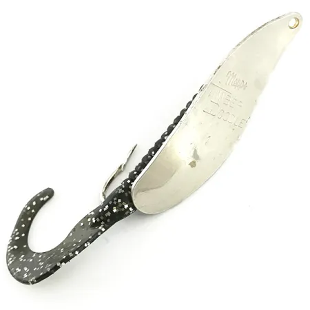 При вазі 12 г лицьова сторона цієї спеціалізованої коливалки має чітке, глибоке гравіювання «Mepps TIMBER DOODLE». При довжині 6 см ця вироблена у США приманка демонструє інноваційний підхід бренду до створення незачіпляйок, що виходить за межі їхніх культових вертушок. Сріблясте покриття забезпечує яскраве відблискування та доповнюється оригінальним чорним твістером зі сріблястими блискітками. Така комплектація розроблена спеціально для лову в густому коряжнику або затоплених кущах, де тіло силіконової приманки захищає одинарний гачок. Під артикулом 5773, ця приманка перебуває у чудовому стані (5/5), зберігаючи дзеркальний блиск металу та ідеально вцілілу м'яку частину. Кріплення в носовій частині виконане у вигляді простого та надійного вушка для прямої прив'язки волосіні або використання невеликої застібки, що забезпечує стабільну гру приманки під час рівномірної проводки крізь густу рослинність.