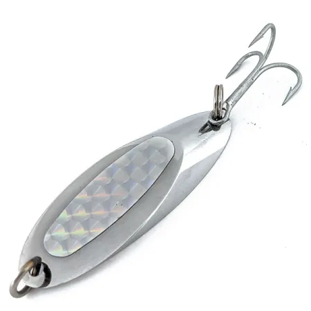 Ця блешня, що має солідну довжину 6,7 см (2 3/4 дюйма), виготовлена в США, а її поліроване нікелеве покриття повністю відповідає стандартам якості виробництва Weber середини минулого століття. Ця модель Mr Champ (артикул 13786) важить чималі 40 г (1 1/3 унції); така вага спеціально розрахована на далекий закид або роботу на великій глибині. Характерною особливістю є срібляста голографічна наклейка, вклеєна по центру блешні, що створює багатогранні відблиски на фоні гладкого металевого тіла приманки. Стан оцінюється як 5 з 5; оснащення включає потужний трійник та міцні заводні кільця в носовій і хвостовій частинах для надійного монтажу. Хоча пізніше Mr Champ випускалася брендом Luhr Jensen, цей конкретний екземпляр належить до раннього періоду майстерності Weber у США. Штампування металу чітке й виразне, воно підкреслює класичний овальний профіль, який десятиліттями залишається незмінним атрибутом у коробках рибалок.