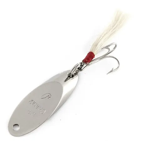 Маркування «1/2 MR CHAMP», виштампуване безпосередньо на нікелевому покритті, вказує на те, що ця блешня вагою 1/2 унції (14 г) є класичним виробом компанії Weber із США. При довжині 2 1/4 дюйма (5,5 см) корпус краплеподібної форми має дзеркальне нікелеве покриття, що забезпечує чудову помітність приманки під час закидання або вертикального блиснення. Помітною деталлю цього примірника з артикулом 21485 є трійник з ручною обмоткою: акуратна червона нитка надійно фіксує опушку з білого оленячого хутра. Фурнітура відмінно збережена, що відповідає стану 5/5, оскільки металеві поверхні залишаються блискучими, а жала гачка — гострими. Потужне заводне кільце з’єднує блешню з оснащеним трійником; така особливість конструкції дозволяє волосяному хвосту плавно йти за металевим тілом приманки. Ця модель від Weber втілює традиційний американський дизайн приманок, де основна увага приділяється надійній металевій конструкції та функціональній опушці для лову в прісній або слабосолоній воді.