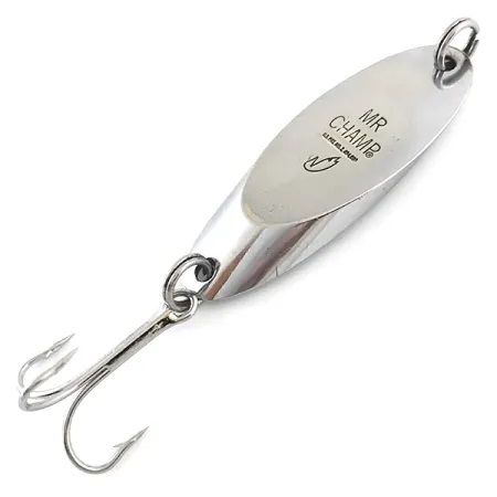 На полірованій поверхні чітко викарбувано маркування «MR CHAMP», що вказує на класичну американську блешню від Weber. Маючи вагу 21 г (3/4 унції), масивне металеве тіло вирізняється яскравим нікелевим покриттям, яке чудово відбиває світло завдяки своїй аеродинамічній формі. Цей екземпляр довжиною 6 см (2 1/4 дюйма) має артикул 5235 і належить до періоду, коли серія ще не була викуплена компанією Luhr Jensen. На лицьовому боці розміщено культовий логотип із рибою, що стрибає, та напис «MR CHAMP», тоді як зворотний бік залишається гладеньким і дзеркальним. Міцне заводне кільце з’єднує гострий трійник із хвостовою частиною, приманка повністю готова для вертикального блешніння або далеких закидань. Ця блешня збереглася в ідеальному стані (5/5), демонструючи високу якість покриття, якою славилася компанія Weber протягом своєї столітньої історії на північноамериканському ринку. Верхнє вушко оснащене потужним кільцем для надійного кріплення жилки.