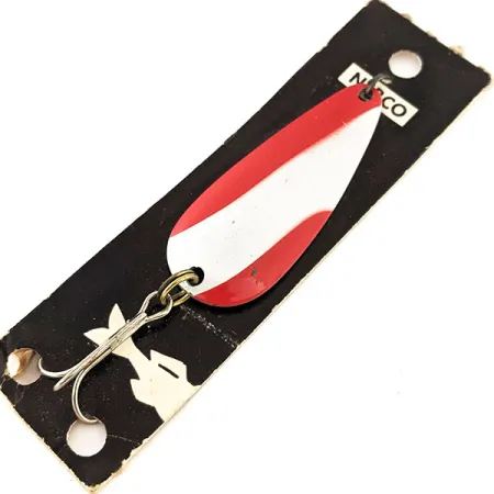 Червоне та біле емалеве покриття створюють контрастний малюнок на цій блешні Nebco FlashBait 266 довжиною 2 1/4" (5,5 см). При вазі 1/3 унції (10 г) ця приманка зберігає свій первинний блиск як новий екземпляр зі США. Червона фарба нанесена класичною хвилею по яскраво-білій основі — таке забарвлення давно цінується рибалками на щуку та баса за його помітність у воді різної прозорості. Металеве тіло закріплене на оригінальній чорній підкладці та оснащене міцним трійником, з'єднаним через заводне кільце. Невелика біла етикетка вказує артикул товару 11623 та назву бренду Nebco. Фурнітура має чисте блискуче покриття, що підтверджує стан речі як збереженої частини американської рибальської історії. У верхній точці кріплення розташоване невелике металеве кільце, готове для застібки або прямого прив'язування жилки.
