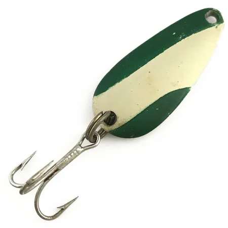 Лицьовий бік цієї вінтажної металевої коливалки вирізняється характерним візерунком із діагональних зелено-білих смуг. На відполірованому нікельованому звороті викарбувано класичне маркування «NEBCO TOR-P-DO-1 MPLS, MINN», що підтверджує її походження з Міннеаполіса, США. Приманка вагою 1/4 унції (7 г) та завдовжки 1 1/2 дюйма (4 см) має артикул 5784. Конструкція має класичний краплеподібний профіль, що підходить для різних технік закидання та тролінгу. Фурнітура надійна й складається з оригінального заводного кільця та гострого трійника. Стан оцінюється як 5/5: лакофарбове покриття зберегло свою чіткість, а нікельований бік має яскравий дзеркальний блиск.
