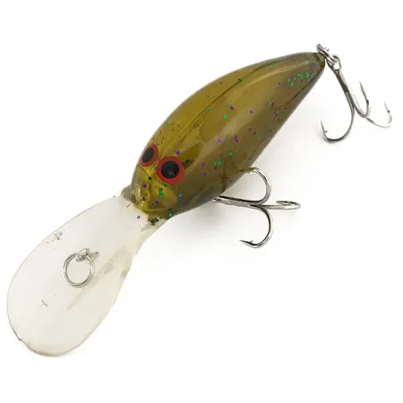 У напівпрозорому тілі цього глибоководного кренка оливкового кольору рівномірно розподілені яскраві фіолетові та зелені блискітки. Ця модель Norman DD 14 (артикул 7478) має довжину 7 см (2 3/4") та вагу 16 г (3/5 унції). Конструкція оснащена внутрішньою шумовою камерою для створення акустичного ефекту у воді та має нейтральну плавучість (суспендер), що дозволяє застосовувати різні техніки проводки. Велика прозора лопать розрахована на заглиблення в межах 3,6–4,2 м (12–14 футів), тому приманка чудово підходить як для ловлі в закид, так і для тролінгу. На голові розташовані виразні червоні очі, які створюють контрастну точку атаки на фоні оливкового корпусу. Фурнітура перебуває у відмінному стані (оцінка 5/5) і включає оригінальні заводні кільця та трійники. Цей виготовлений у США воблер демонструє класичний силует Norman із фірмовим пластиком, насиченим блискітками.