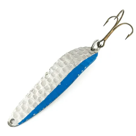 Уздовж зовнішнього краю цієї нікелевої блешні завдовжки 6,7 см проходить виразна синя смуга, що створює чіткий контраст зі сріблястим корпусом. Ця Gator Ottogator виготовлена в США і знаходиться в ідеальному стані (5/5): як фактурна, так і гладка сторони мають яскраву дзеркальну поверхню. Вага 12 г забезпечує стабільний закид та дозволяє впевнено тримати горизонт під час проводки. Глибока насічка на лицьовій стороні активно відбиває світло під будь-яким кутом, а на звороті розташована гладка полірована поверхня з фірмовим клеймом Ottogator. Модель під артикулом 9267 оснащена надійним заводним кільцем та гострим трійником, на яких майже не помітно слідів часу.