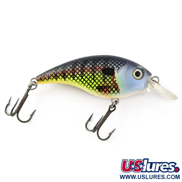 При довжині 6 см ця приманка вирізняється деталізованою текстурою луски у вигляді стільників на багатоколірному корпусі. Ozark Trail Squarebill (артикул 20574) має яскраве жовто-зелене черевце, колір якого плавно переходить у м’який синювато-сірий відтінок голови. Виразна чорна пляма біля «плеча» доповнена невеликим червоним акцентом, що створює точку атаки на фоні темної сітчастої текстури вздовж спинки. При вазі 10 г плаваючий корпус оснащений внутрішньою брязкальцею для створення шумового ефекту. Його прозора квадратна лопатка забезпечує заглиблення до 1,5 м, що робить воблер зручним як для закидання, так і для тролінгу. Приманка оснащена двома трійниками з темним покриттям, які збереглися у відмінному стані. Стан оцінюється на 4/5: покриття залишається яскравим, а деталізована графіка луски чудово збережена.