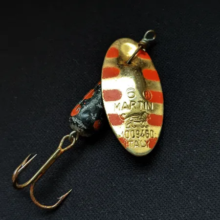 Яскраві червоні смуги прикрашають поліровану золотисту пелюстку цієї вінтажної італійської вертушки. При вазі 3/16 унції (6 г) та довжині 2 дюйми (5 см), ця модель має овантажений сердечник у формі краплі чорного кольору, прикрашений виразними червоними цятками. Ця Panther Martin 6, що проходить за каталогом під кодом 16618, має характерну конструкцію, де пелюстка надіта безпосередньо на вісь без використання традиційної дужки. На опуклому боці металу чітко викарбовано назву «MARTIN», номер 1009460 та країну походження «ITALY». Приманка добре збережена, має незначні сліди використання, що відповідають віку та оцінці 4/5. Оснащення включає міцний трійник, закріплений на центральній дротяній осі, що відображає надійність конструкції, якою ці ранні вертушки були відомі серед любителів лову форелі та окуня.