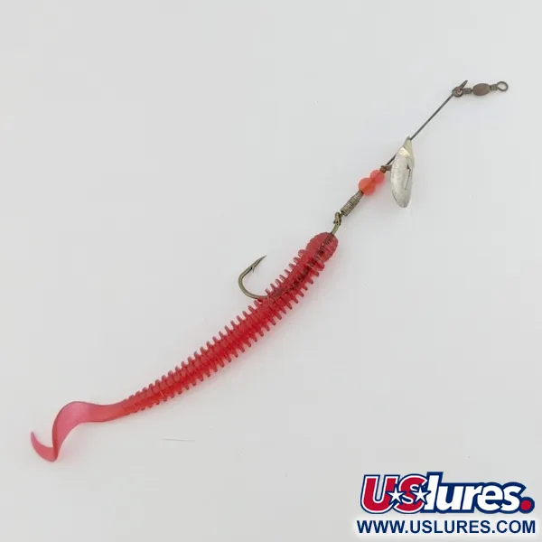 Нікелеве покриття пелюстки цього спінера вагою 3/16 унції (6 г) забезпечує делікатні відблиски на фоні яскраво-червоного м’якого пластикового хвоста. При загальній довжині 10 см (4"), Pflueger June Bug №4 оснащений фірмовим зміщеним важелем, розробленим для того, щоб пелюстка оберталася без перешкод з основним стрижнем. Дві червоні намистини на дроті додають колірного акценту та допомагають збалансувати оснастку. Приманка оснащена одинарним гачком, на який насаджений ребристий твістер, що значно збільшує її візуальний профіль. Стан оцінено у 4/5: металевий дріт та компоненти повністю зберегли свою структурну цілісність. Ця модель під артикулом 24501 є класичним прикладом комбінованої приманки, що поєднує металевий елемент з м’яким трейлером.