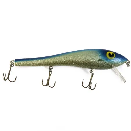 Виготовлена з плавучого кедра, ця приманка довжиною 15 см (6 дюймів) має виразний синьо-сріблястий градієнт із блискітками, що відтворює природний блиск малька. Корпус вагою 17 г (3/5 унції) оснащений прозорою лопаттю з чітким відтиском логотипа Poe’s та трьома гострими трійниками. Характерні жовті «лялькові» очі з чорними зіницями створюють контрастний акцент на темно-синьому фоні голови. Приманка під артикулом 16895 має оцінку стану 4/5: корпус добре зберігся, а фурнітура у відмінному стані. Вибір кедра забезпечує саме ту щільність, що потрібна для стабільної гри та плавучості під час глибокої проводки.