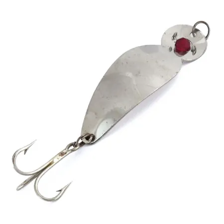 Червоні очі-камінці, акуратно вмонтовані в голову 10-сантиметрового (4") металевого корпусу, надають цій вінтажній коливалці вигляду, що суттєво відрізняється від сучасних серійних приманок. На зворотному боці чітко викарбувана назва моделі — Popeye (артикул 9840). Блешня має поліроване нікелеве покриття, яке чудово зберігає яскравий відблиск. При вазі у 28 г (1 унція) металеве тіло має плавний вигин, розрахований на далеке закидання та стабільну гру у воді. Оснащення складається з надійного трійника та заводних кілець у носовій і хвостовій частинах; усі елементи добре збереглися, що відповідає оцінці стану 4/5. Цей екземпляр уособлює особливу епоху американського дизайну снастей, де практичність металу поєднувалася з декоративним оздобленням. Нікельована поверхня чиста, з ледь помітними слідами часу, характерними для речі, що дбайливо зберігалася.
