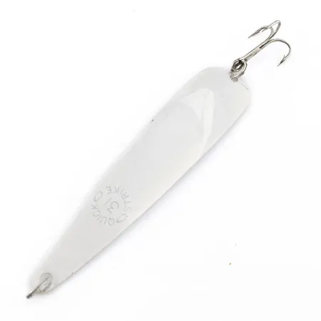 На нижній частині тіла блешні чітко викарбувано маркування «QUICK STRIKE 31», що вказує на цю вінтажну коливалку американського виробництва. При довжині 9,5 см (3 3/4") та вазі 4,5 г (3/16 унції) приманка має вузьке, видовжене тіло з дзеркальним сріблястим покриттям. Цей конкретний екземпляр зберігся у відмінному стані: відбивна поверхня лишається яскравою, а вся фурнітура повністю неушкоджена, що відповідає оцінці стану 5/5. В широкій основі через заводне кільце закріплено один трійник, тоді як у вузькій носовій частині розташовано акуратний отвір для кріплення волосіні. Занесена до каталогу під артикулом 22320, ця рідкісна модель вирізняється простою, проте ефективною металевою конструкцією, призначеною для лову в закид або тролінгом.