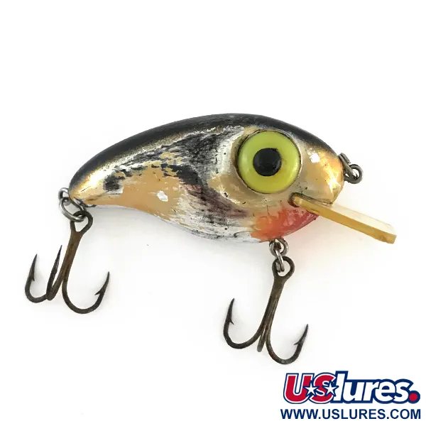 Вага 1/3 унції (8,5 г) робить цей Rabble Rouser Angel-Eye вдалим вибором для точного закидання. Сріблястий корпус підкреслений золотистими та чорними акцентами вздовж спинки, а в зоні горла розташована характерна помаранчева пляма. Оправдовуючи свою назву «Angel-Eye», приманка вирізняється великими опуклими жовтими очима з глибокими чорними зіницями, що слугують контрастною точкою атаки. Прозора квадратна лопатка в носовій частині забезпечує глибоководне проведення. Ця вінтажна приманка американського виробництва (артикул 8129) має довжину 2 дюйми (5 см) і оснащена оригінальними трійниками з бронзовим покриттям. Стан оцінено на 4/5: помітні незначні косметичні дефекти та природне старіння фарби, що пояснюється тривалим перебуванням у колекційній коробці. Конструкція корпусу та розташування гачків є характерними для періоду виробництва Rabble Rouser у США.