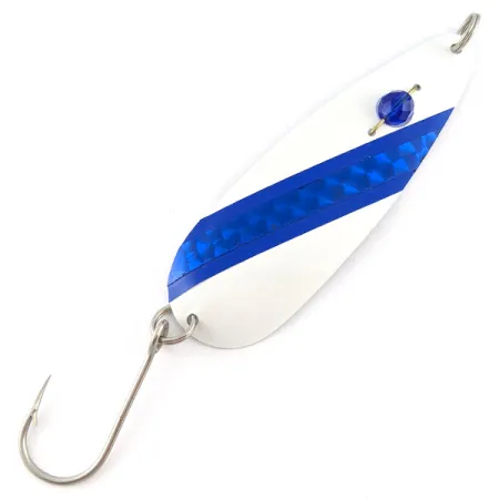 Яскрава синя стрічка з візерунком «стільники» вдало доповнює чисто-біле покриття цієї блешні Red Eye Evil Eye. При довжині 9 см (3 1/2") та вазі 9 г (1/3 унції) її силует розроблений для кращої помітності як під час тролінгу, так і при лові в закид. Фірмове синє «око» з гранованої намистини — класична риса приманок Red Eye Lures виробництва США — надійно закріплене крізь штампований металевий корпус. Цей екземпляр з оцінкою стану 5/5 зберіг ідеальний вигляд лакофарбового покриття та фурнітури, що включає одинарний гачок на заводному кільці. Артикул 23367 демонструє майстерне поєднання різних текстур для привабливої гри світла під будь-яким кутом.