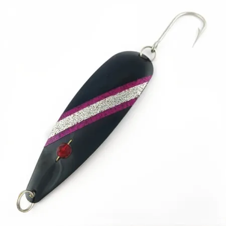 Ця блешня довжиною 5 дюймів (13 см) має насичене чорне покриття, доповнене виразними діагональними смугами з рожевих та сріблястих блискіток. Ця Red Eye Evil Eye вагою 2/3 унції (18 г) є класичним зразком американської історії рибальських снастей, виготовленим компанією Red Eye Lures у США. Візитною карткою цієї моделі є гранена червона скляна намистина, закріплена біля хвоста, яка і дала назву приманці. Колекціонери оцінять стан 5/5: блешня має чисту поверхню та оригінальну фурнітуру, зокрема міцний одинарний гачок і переднє заводне кільце. Модель з артикулом 23980 має вузький профіль і призначена для лову в закид або тролінгом. Поєднання темного тіла з контрастними смугами блискіток створює особливий візуальний образ, який часто використовують в умовах низької освітленості або на великій глибині. Конструкція з товстостінного металу та надійно зафіксована дротом намистина є характерними ознаками високих стандартів міцності, якими славилася продукція Red Eye Lures у роки свого виробництва.