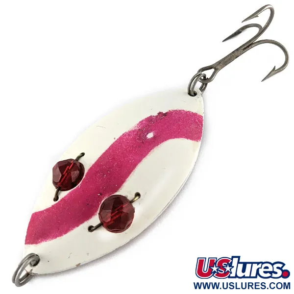 Ця класична модель від Hofschneider, пофарбована в чистий білий колір з виразною діагональною малиново-рожевою смугою, виділяється в будь-якій вінтажній колекції. При вазі 1 унція (25 г) ця коливна блешня довжиною 3 дюйми (7,5 см) розроблена для повільної проводки, яка часто необхідна, щоб спокусити пасивну щуку в літню спеку. Головна особливість, що дала назву моделі, помітна відразу: два гранчастих скляних ока рубінового кольору надійно закріплені дротом крізь металевий корпус, щоб вигравати відблисками під час руху в товщі води. На зворотному боці чітко вибито назву «RED EYE WIGGLER», номер патенту 1847357 та маркування Hofschneider Corp. Rochester, N.Y. Цей примірник під артикулом 17172 зберігся у гарному стані (4/5): помітні лише незначні поверхневі потертості, тоді як вся фурнітура лишається цілою. Міцний трійник кріпиться за допомогою посиленого заводного кільця у хвостовій частині — приманка готова до ловлі окуня чи щуки. Американська якість виконання проявляється у значній товщині металу, що забезпечує вагу, необхідну для далеких закидів у глибокі місця з вираженим рельєфом.