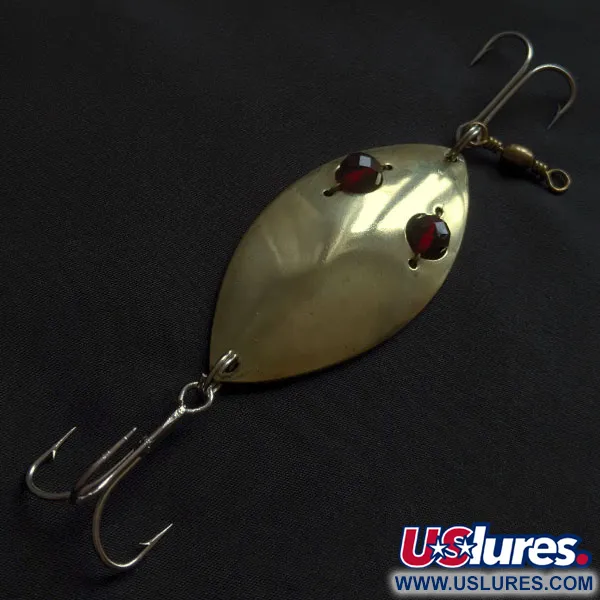 Грановані червоні скляні очі, розташовані так, щоб вловлювати та заломлювати світло навіть на глибині, визначають характер цієї класичної блешні. На зворотному боці чітко вибито назву «RED EYE WIGGLER» поруч із клеймом компанії Hofschneider Corp. з Рочестера, штат Нью-Йорк. При довжині 7,5 см (3") та вазі 25 г (1 унція) цей золотистий екземпляр (артикул 22123) створений для важкого закидання або тролінгу. Полірована золотиста поверхня перебуває в ідеальному стані (5/5), зберігаючи яскравий блиск по всій довжині. Оснащення включає встановлений зверху подвійний гачок між скляними очима та традиційний трійник у хвостовій частині. До носової частини прикріплений латунний вертлюжок, що забезпечує надійне з'єднання з повідцем. Ця конструкція найкраще проявляє себе на повільній проводці; її часто використовують для лову щуки або великого окуня, коли активність риби знижується.