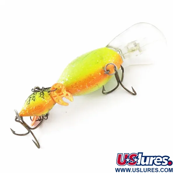 Колір Fire Tiger із золотистими блискітками вкриває східчастий корпус воблера Renosky Lures Guido's Double Image. Приманка вагою 9,5 г (1/3 oz) і довжиною 6 см (2 1/4") має незвичну форму, розроблену Габріелем «Guido» Реноскі для імітації силуету двох дрібних рибок, що пливуть поруч. Прозора лопатка цієї плаваючої моделі забезпечує заглиблення 0,3–1,6 м при закиданні та до 2,1 м під час тролінгу. Невеликі помаранчеві пластикові трейлери на черевному гачку створюють додатковий контраст на фоні яскравого жовто-зеленого черевця. Внутрішні брязкальця додають звуковий елемент, що робить презентацію ефективною як при рівномірній проводці, так і при проводці stop-and-go. Цей екземпляр у стані 5/5 зберігає свій оригінальний колір та унікальний профіль, занесений до каталогу за кодом 24467.