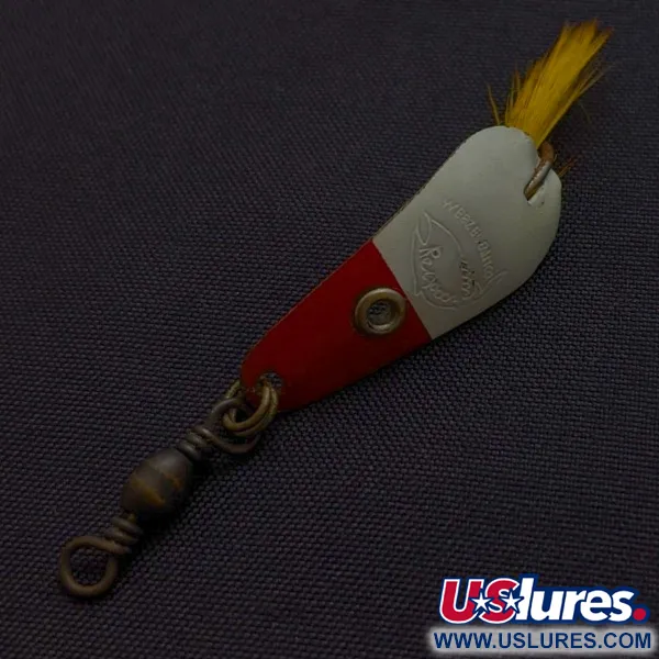Штампована з характерним логотипом риби Rex на сріблястій верхній частині, ця металева блешня має класичне червоно-біле забарвлення. При вазі 1/16 унції (1,7 г) та вказаній довжині 111 1/4" (282,82 см), корпус оснащений одинарним гачком, прикрашеним жовтим пір'ям. Пір'я закріплене щільною обмоткою червоної нитки, що створює яскравий акцент на хвості, який контрастує з основним покриттям. До переднього вушка приєднаний вертлюг-бочечка, щоб запобігти закручуванню волосіні під час використання. Маркування Weezel чітко видно на металевій поверхні поруч із рельєфним зображенням риби. Маючи мінімальні ознаки старіння на фарбі, цей екземпляр зберігає оцінку стану 4/5. Модель 24517 демонструє просту, але ефективну фурнітуру, характерну для вінтажних багатокомпонентних приманок.