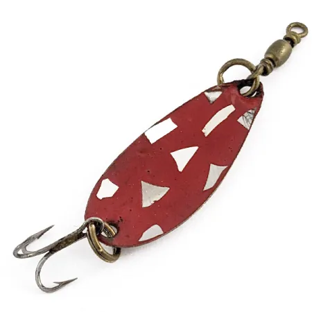 Червоне лакофарбове покриття, нанесене поверх нікелевої основи, визначає зовнішній вигляд цієї рідкісної знахідки вагою 1,5 г (3/64 унції), відомої серед колекціонерів як Roy Self №1. Поверхня оздоблена хаотичними геометричними вкрапленнями нікелю, що переривають червоний колір — це класичний елемент дизайну Роя Селфа, покликаний створювати яскраві відблиски. Цей конкретний екземпляр з артикулом 23043 має компактний розмір 3,3 см (1 1/4") і є чудовим зразком майстерності виготовлення вінтажних коливалок. З обох кінців блешня оснащена заводними кільцями латунного відтінку: на верхньому кільці встановлено вертлюжок-барильце, а на нижньому — трійник. Приманка перебуває у відмінному стані, з добре збереженим покриттям та чистою фурнітурою, що заслуговує на оцінку стану 5/5. Нікельована поверхня на звороті блискуча й відповідає високій якості гальванічного покриття, характерного для виробництва снастей середини минулого століття.