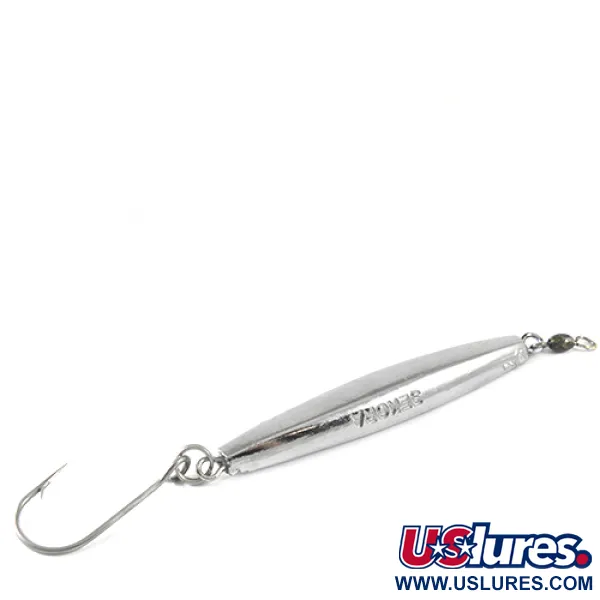 Нікелеве покриття надає цьому джигу Capt. Sekora Montauk виразного відблиску. При довжині 9 см (3 1/2 дюйма) на його вузькому металевому тілі чітко викарбувано ім’я виробника, що підтверджує походження цієї класичної приманки американського виробництва. Завдяки вазі 56 г (2 унції) SEKORA S 2 має необхідну масу для закидів крізь морські бризки або для облову глибинних ділянок. Цей екземпляр під артикулом 1643 має оцінку стану 4/5, демонструючи добре збережену поверхню, що ефективно грає на світлі. Фурнітура складається з великого одинарного гачка, закріпленого на заводному кільці, та надійного вертлюга в головній частині, що відображає просту й міцну конструкцію, характерну для традицій серфової риболовлі Монтаука.