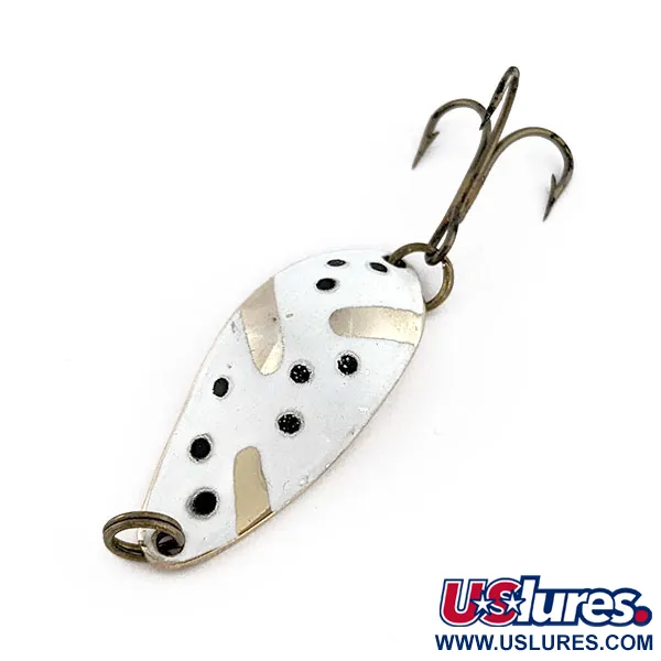 На золотистому звороті чітко викарбувано назву LITTLE CLEO, що вказує на приналежність до класичних блешень Seneca. Ця модель довжиною 3 см (артикул 18466) має біле покриття на опуклому боці, доповнене виразними чорними цятками та відкритими ділянками золотистого металу. При вазі 5 г приманка розрахована на ловлю в закид та тролінг, де використовуються відблиски її полірованої латунної основи. Оригінальний трійник із бронзовим напиленням надійно закріплений через міцне заводне кільце; стан оцінюється як 5/5. Завдяки компактному профілю та щільності металу, ця виготовлена в США коливалка забезпечує значну дальність польоту при закиданні. Фарба залишається чистою та яскравою на всій поверхні пелюстки.