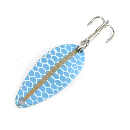 Довжиною 3 см (1 1/4 дюйма), ця класична коливалка має характерний синьо-білий візерунок у вигляді стільників, доповнений виразною золотистою вертикальною смугою. На зворотному боці полірованої блешні чітко викарбовано назву «LITTLE CLEO» — фірмовий знак оригінальної продукції компанії Seneca Lure до того, як бренд перейшов у власність Acme на початку 1980-х років. При вазі 5 г (3/16 унції) оснащення включає міцний трійник сріблястого кольору та надійне заводне кільце, розраховані на впевнений закид або тролінг. Цей конкретний екземпляр з артикулом 23377 зберігся у невикористаному стані та демонструє високу якість фінішного покриття, притаманну вінтажним снастям американського виробництва. Вага та краплеподібна форма є характерними для оригінального дизайну Seneca, розробленого для лову різноманітних видів прісноводної риби. Це добре збережений зразок рибальської історії, що вберіг фабричний блиск і чіткість кожної деталі фарбування.