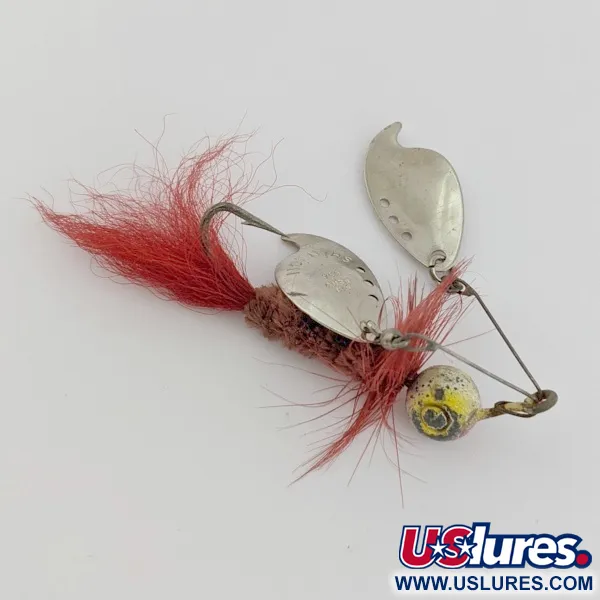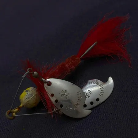 На нікельованих пелюстках викарбувано «SHANNON» та «PAT PEND USA» — фірмові знаки дизайну Jamison, який випускався з 1920-х до 1940-х років. Цей 5-сантиметровий Shannon Twin Spinner поєднує подвійні пелюстки з яскраво-червоним хвостом із хакла та текстурованим коричневим тілом із синелі. Приманка вагою 10 г має свинцеву джиг-головку з жовто-чорним покриттям, що зберегло свій характер (стан 4/5). Дротяний каркас розміщує вертушки над тілом, що дозволяє ловити у густих заростях чи водоростях. Червоне пір'я залишається пишним і яскравим, створюючи контраст із металевим нікелем пелюсток. Модель #24491 є втіленням ранніх інновацій у дизайні незачіпляйок.