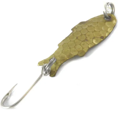 Фактура «битої латуні» надає цій вінтажній коливалці виразного вигляду луски, що допомагає їй імітувати дрібного малька у прозорій воді. При довжині 1 1/4" (3 см) та вазі 1/32 унції (1,1 г), Shoff's Triple Teazer є незамінною ультралайтовою класикою зі США. Цей конкретний екземпляр з артикулом 4099 зберігся у стані 4/5: він має чисту поверхню та чітко виражені штамповані плавці по краях тіла, виконаного у формі рибки. Блешня оснащена сріблястими заводними кільцями в носовій та хвостовій частинах у парі з одним гострим гачком. Силует імітує невеликого малька зі звуженим хвостом та дещо ширшою передньою частиною. Карбована поверхня лицьового боку створює багатогранну гру відблисків, тоді як увігнута спинка залишається гладенькою, демонструючи природний колір латуні.