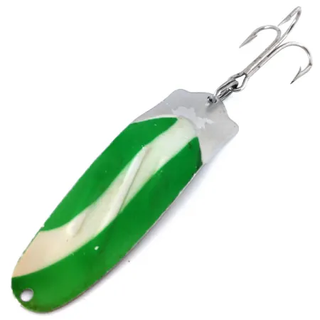 Діагональне нанесення зеленої та кремової фарби створює виразний візерунок на зовнішній стороні цієї класичної коливної блешні. Модель Shur-katch «The Drifter» (артикул 10332), яку можна впізнати за фірмовим клеймом на увігнутому боці, є спеціалізованою розробкою для лову тролінгом. Сріблястий зворотний бік забезпечує контрастне відблискування, а хвостова частина оснащена міцним трійником, що кріпиться на надійному заводному кільці. Стан цього примірника оцінюється на 4/5: на металі помітні незначні подряпини, а на фарбі — легкі сліди зносу, що підкреслюють вінтажний статус приманки, яка при цьому залишається в гарній збереженості. Просте вушко для кріплення у найвужчій частині гарантує надійне з'єднання для глибоководного тролінгу.