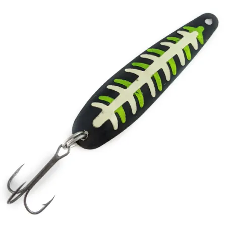 Матове чорне покриття слугує фоном для світлонакопичувального візерунка у вигляді скелета на цій блешні вагою 8,5 г (1/3 унції). Вироблена в США модель Slammer Glow (артикул 22551) вирізняється контрастним зелено-білим забарвленням, що світиться у темряві. Металевий корпус довжиною 8,5 см (3 1/4 дюйма) знаходиться у стані 5/5, малюнок чіткий і без пошкоджень. На звороті приманка має суцільне світлонакопичувальне покриття молочного кольору для видимості на глибині чи в каламутній воді. Одне заводне кільце з’єднує трійник із темним покриттям з хвостовою частиною, а звужений ніс має отвір для застібки чи повідця. Перехід кольору між неоновими зеленими деталями та білим скелетом залишається чітким по всій довжині приманки.
