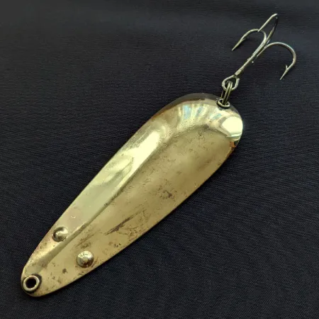 Виготовлена з масивного шматка латуні, ця коливалка вагою 21 г (3/4 унції) має характерний профіль, який так цінують колекціонери снастей South Bend. При довжині 9 см (3 1/2 дюйма) тіло блешні має блискучу латунну поверхню з лицьового боку та дві помітні заклепки біля носової частини. На зворотному боці викарбуване клеймо South Bend — деталь, що підтверджує її вінтажний статус. Цей екземпляр під артикулом 20498 оснащений оригінальним трійником та переднім вушком. Стан оцінено на 4/5: на поверхні помітне легке потемніння та невеликі вікові плями, що нагадують про минулі сезони. Масивна конструкція з товстого металу свідчить про те, що блешня розрахована на тривалу службу та дальні закиди.