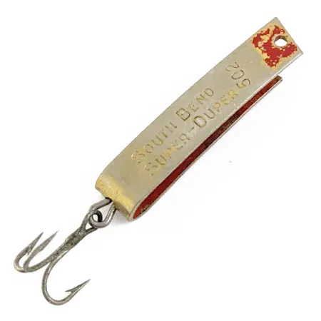 Чітке маркування «SOUTH BEND SUPER-DUPER 502», виштампуване на нікелевому покритті, свідчить про те, що цей екземпляр є класикою американської рибальської історії. При довжині 1 1/4" (3 см) зігнутий металевий корпус має характерну U-подібну форму, розраховану на закидання легкою снастю та тролінг. Ця приманка вагою 3/32 унції (2,5 г) зберегла свій первинний блиск, хоча червона фарба біля петельки для волосіні має природні сліди зносу. На звороті, на нижньому вигині корпусу, виштампувано напис «PAT. PEND'G», що характерно для ранніх партій випуску моделі під кодом 16953. Стан оцінюється на 4/5: на металевій поверхні є поодинокі подряпини від зберігання в рибальській коробці. Одинарний трійник кріпиться до заднього вигину через заводне кільце, що завершує оригінальну комплектацію.