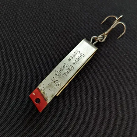 Маркування, вибите безпосередньо на нікелевому покритті, вказує, що перед нами South Bend Super-Duper 503 — класична американська блешня на форель. Цей конкретний екземпляр з артикулом 18868 має триколірне забарвлення (нікель, золото та червоний), де червоний акцент нанесений біля місця кріплення жилки. При довжині 3,5 см та вазі 4,3 г унікальна U-подібна форма сконструйована так, щоб ефективно «чіплятися» за воду, що робить її універсальним вибором як для закидання, так і для тролінгу на легку снасть. На внутрішньому згині чітко видно штамп «PAT. PEND'G», що відсилає до історії американського виробництва бренду середини минулого століття. Оснащення складається з одного трійника, закріпленого за допомогою заводного кільця на вигині металевого тіла. Стан оцінюється на 4/5: на металі помітні незначні сліди використання, які додають виробу автентичності, не псуючи загального вигляду. Хоча ця модель вважається перевіреною класикою для форелі, рибалки часто використовують її для ловлі окуня та щуки у прісних водоймах.