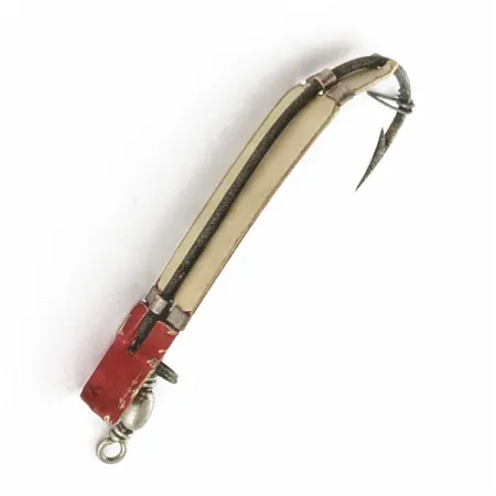 Ця червоно-біла нахлистова приманка завдовжки 4,5 см — класичний виріб компанії South Bend 1940-х років. Модель Trix-Oreno під артикулом 24087 важить усього 2 г і була спеціально розроблена, щоб допомогти нахлистовикам обловлювати глибші шари води. Дизайн вирізняється тонким тілом кольору слонової кістки, що прикріплене до гачка металевими смужками, та яскраво-червоною голівкою. Стан оцінюється на 4 з 5: на приманці помітні лише незначні сліди часу, а фарба та металева фурнітура добре збереглися. Історично South Bend рекомендувала закидати цю приманку впоперек або вниз за течією річки, де вона мала природно занурюватися, імітуючи підводну живність. Така гра допомагала дістати форель на початку сезону або спокусити велику рибу на глибині в літній період. Оснащення включає невеликий дротяний вертлюжок у місці кріплення та одинарний гачок у задній частині, спрямований жалом догори.