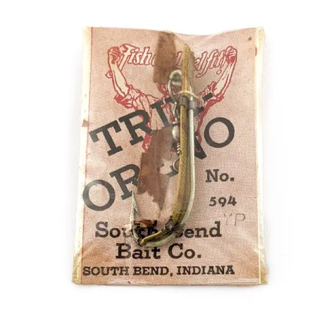 Зелені та золотисті відтінки прикрашають покриття цієї нахлистової приманки вагою 1/16 унції (2 г) — класичної знахідки для колекціонерів снастей South Bend середини минулого століття. Модель Trix Oreno 594 завдовжки рівно 1 3/4 дюйма (4,5 см) була надзвичайно популярною у 1940-х роках; рибалки часто використовували її для лову форелі у глибоких плесах під час літньої спеки. Цей екземпляр з артикулом 21698 зберігся новим в оригінальній упаковці, на якій є характерне штампування «YP» та вінтажні зображення рибалки від компанії South Bend Bait Co. з Індіани. Металевий корпус приманки збалансований так, що після закидання вона плавно занурюється, наче жива комаха, і не потребує додаткової анімації для привернення уваги. На проводці фурнітура та форма тіла змушують її пірнати й рискати, імітуючи рухи малька. На вкладиші наведені технічні характеристики моделі 594, де особлива увага приділяється малій вазі, розрахованій на зменшення навантаження на тендітні нахлистові вудлища.