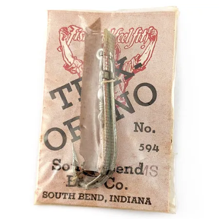 При довжині 4,5 см (1 3/4 дюйма) ця металева приманка у сріблясто-червоному забарвленні є втіленням класичного дизайну середини минулого століття. При вазі 2 г (1/16 унції) модель South Bend Trix-Oreno 594 була розроблена спеціально для нахлистового вудлища, оскільки вона легша за звичайну вертушку, що полегшує маніпулювання нею у воді. Цей екземпляр має артикул 21699 і жодного разу не використовувався, зберігшись в оригінальній паперово-пластиковій упаковці від компанії South Bend Bait Co. з Індіани. Конструкція приманки дозволяє їй під час занурення тріпотіти, наче жива комаха, що допомагає дістати форель та іншу рибу в глибоких ямах на початку сезону або у спекотні дні. На проводці вона занурюється, пірнає та кидається в різні боки, імітуючи рухи малька. В оригінальній інструкції зазначено, що ця модель оснащена гачком №1 і демонструє чудові результати при використанні з підсадкою зі свинячої шкірки.