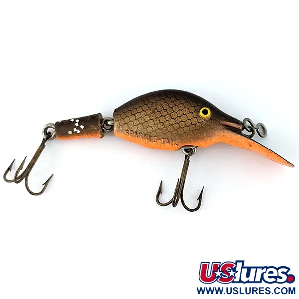 Колірна гама цієї класичної американської приманки поєднує коричневі та помаранчеві відтінки. Темно-коричнева спинка з фактурним малюнком луски плавно переходить у тепле помаранчеве черевце. Цей примірник вагою 3/16 унції (5,5 г) — модель Eppinger Sparkle Tail (артикул 13945), довжина якої становить 2 1/4 дюйма (6 см). Головною особливістю приманки є рухома задня частина, завдяки якій модель і отримала свою назву; на боці корпусу чітко видно відтиснутий напис «SPARKLE-TAIL». Воблер оснащений інтегрованою в головну частину глибоководною лопаттю та петлею для волосіні у формі вісімки, що робить його ефективним як для закидання, так і для тролінгу при лові щуки, форелі чи лосося. Стан покриття оцінюється на 5/5 — воно чудово збереглося, з яскраво-жовтими очима та характерними сріблястими блискітками на рухомому сегменті хвоста.