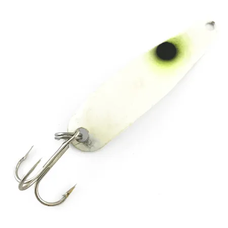 При вазі рівно 3/16 унції (5 г), ця виготовлена в США тролінгова блешня є чудовим прикладом приманки з високою помітністю від бренду Advance Tackle. Ця модель під назвою Stinger Scorpio Glow (артикул 4283) має довжину 2 1/4 дюйма (5,5 см) та вирізняється білою лицьовою стороною з однією чорною точкою в м’якому жовтому обрамленні. Спеціальне покриття забезпечує виразне зелене плямисте світіння у темряві, що дуже ефективно для видимості приманки під час глибоководного тролінгу. Стан оцінюється на впевнені 4/5: покриття чисте та яскраве, а металева фурнітура — у належному стані. Гострий трійник надійно закріплений у хвостовій частині за допомогою міцного заводного кільця.