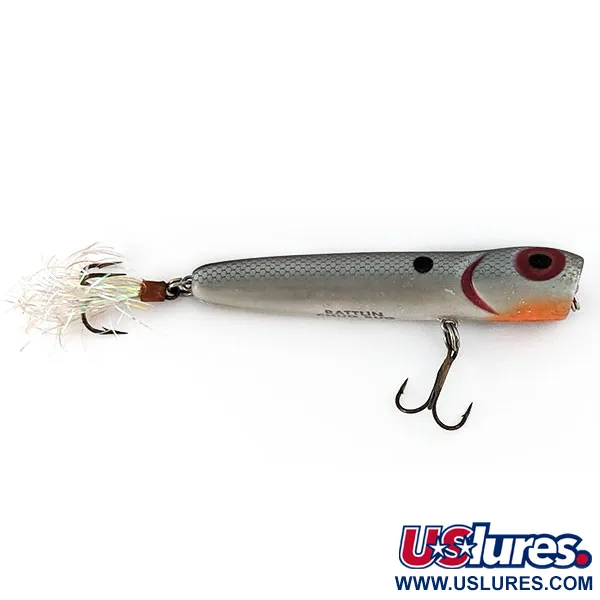 Спинка цієї поверхневої приманки довжиною 8,5 см вкрита сріблястим малюнком луски, що створює чіткий контраст із білим черевцем. Цей Storm Chug Bug (артикул 15366) — класичний американський поппер, розроблений спеціально для поверхневого лову таких видів, як щука та окунь. При вазі 11 г він має внутрішню шумову камеру, призначену для створення звукового супроводу під час проведення по поверхні води. Голова деталізована виразними червоними очима та насиченим переходом від помаранчевого до червоного кольору в зоні рота та «підборіддя». На боці розташована чітка чорна пляма, що слугує класичною точкою атаки для хижака. Фурнітура складається з двох трійників, причому задній гачок має опушку ручної роботи з білого пір'я та блискучого люрексу. Цей екземпляр перебуває в ідеальному стані (5/5), зберігши заводське лакофарбове покриття по всій довжині. Передня виїмка повністю пофарбована в червоний колір, що плавно переходить у текстуру луски, яка визначає профіль цієї вінтажної серії Storm.