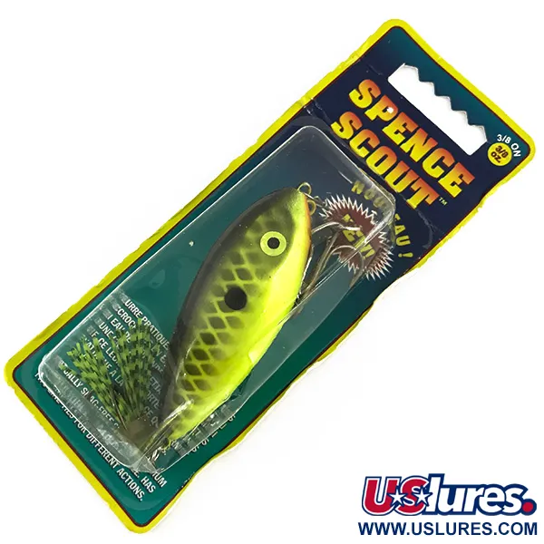 Приманка вагою 10,5 г (3/8 унції) у характерному забарвленні «шартрез» із чорною лускою та виразною точкою на боці (колір 245 535) збереглася в оригінальному пакуванні. Strike King Spence Scout (код товару 7403) довжиною 6,5 см (2 1/2 дюйма) — це плаваюча шумова приманка, розроблена для поверхневої та приповерхневої ловлі. Ця конкретна версія «New Scout» відрізняється двома точками кріплення волосіні, що дозволяє змінювати горизонт проводки від 0,3 до 0,9 м (1–3 фути) залежно від обраного кільця. Виготовлена в Мексиці, приманка не була у використанні та збереглася в оригінальному стані з оцінкою 6. Яскраве жовте око та сітчастий малюнок луски на боках забезпечують контрастний силует для ловлі баса у каламутній воді.