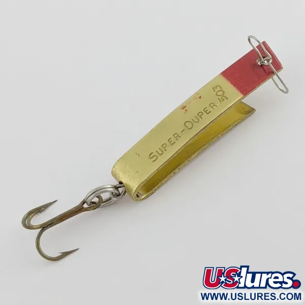 Яскраво-червоний кінчик забезпечує різкий контраст із золотистим металом цієї класичної U-подібної коливної блешні. Безпосередньо на корпусі викарбовано назву SUPER-DUPER 503 разом із патентом № 2719378, що вказує на справжню спадщину Luhr Jensen. Цей зразок виробництва США має чорні написи, які залишилися чіткими, що сприяє його стану 5/5. Незвичайна вигнута конструкція розроблена для ефективного опору воді під час тролінгу або закидання на легкій волосіні. Уся оригінальна фурнітура в наявності, включаючи трійник, прикріплений за допомогою заводного кільця, і дротяну застібку на кінці для кріплення волосіні. Ця модель, яку часто можна знайти в наборах відданих рибалок на форель і окуня, є квінтесенцією рибальської історії середини століття. Золоте напилення зберігає свій первісний блиск по всій довжині вигнутої металевої рами. Цей товар занесений до каталогу під кодом 24435.