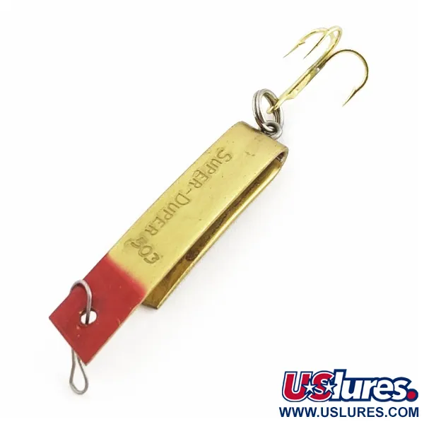 Чітке маркування SUPER-DUPER 503, вибите на латунній поверхні, ідентифікує цю класичну приманку Luhr Jensen довжиною 3,5 см. Яскраво-червоний кінчик контрастує з полірованим золотистим покриттям, створюючи помітну мішень для форелі або окуня. Унікальний U-подібний профіль виготовлений із суцільної зігнутої металевої пластини — ця конструкція залишається базовою у рибальських скриньках протягом десятиліть. Вага 4,3 г робить цей екземпляр ідеальним для закидання на легкій волосіні або повільного тролінгу в прозорій воді. Ця приманка збереглася у відмінному стані 5/5, демонструючи первісний блиск позолоти та чіткість червоної фарби. Місце кріплення волосіні розташоване на пофарбованому в червоний колір кінці, тоді як золотистий трійник знаходиться ззаду.
