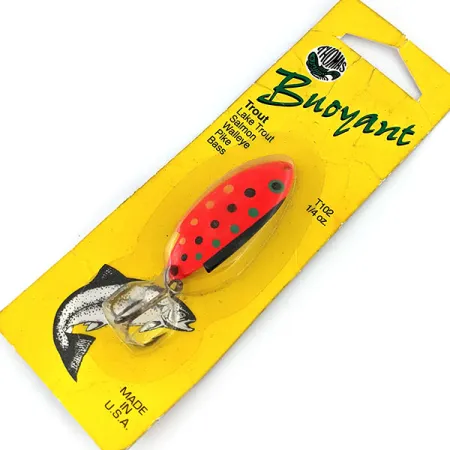 Маючи вагу рівно 1/4 унції (7 г), ця виготовлена в США коливальна блешня вирізняється яскравим флуоресцентним червоним покриттям, доповненим характерним візерунком із чорних та зелених цяток. Приманка з артикулом T102FR довжиною 1 3/4 дюйма (4,5 см) зберігається в оригінальній упаковці на жовтій картонній підкладці та має оцінку стану «6» як невживаний екземпляр. Компанія Thomas Spinning Lures, Inc. із Гоулі, штат Пенсильванія, розробила модель Buoyant для імітації хаотичних рухів наляканого малька; ця форма залишається основною приманкою для ловлі форелі та лосося з моменту отримання патенту в 1946 році. Помітна здалеку червона фарба нанесена на якісний металевий корпус, що в поєднанні з полірованим зворотним боком створює двоколірний відблиск. Кожна деталь, від класичного зображення форелі на підкладці до штампа «Made in U.S.A.», свідчить про багаторічну історію бренду Thomas у рибальському світі.